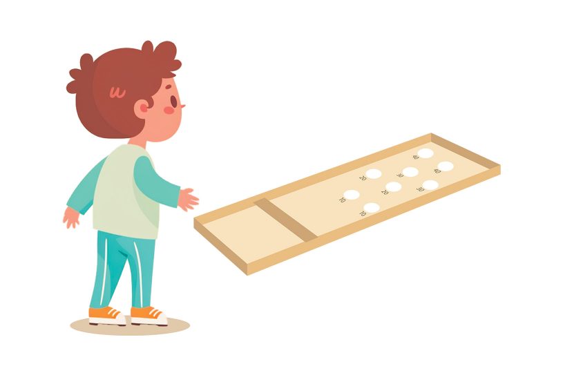 Le but : Les enfants doivent faire glisser une balle et la faire tomber dans un des trous à l’aide de baguettes qui rapportera des points.