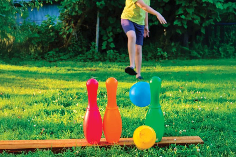 Le matériel : Vous pouvez fabriquer plusieurs jeux de quilles avec des bouteilles en plastique lestées ou en bois. Vous trouverez un jeu de quilles en bois ici.