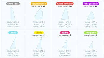 Pour en savoir plus sur les voiles des bateaux de course au large, de leur fabrication à leur utilisation en navigation clique ici .Les navigateurs adaptent la surface de voilure en fonction de la force du vent. Ils hissent plus ou moins la grand voile  (cela s’appelle « prendre un ris ») et ajoutent une voile d’avant plus ou moins grande.